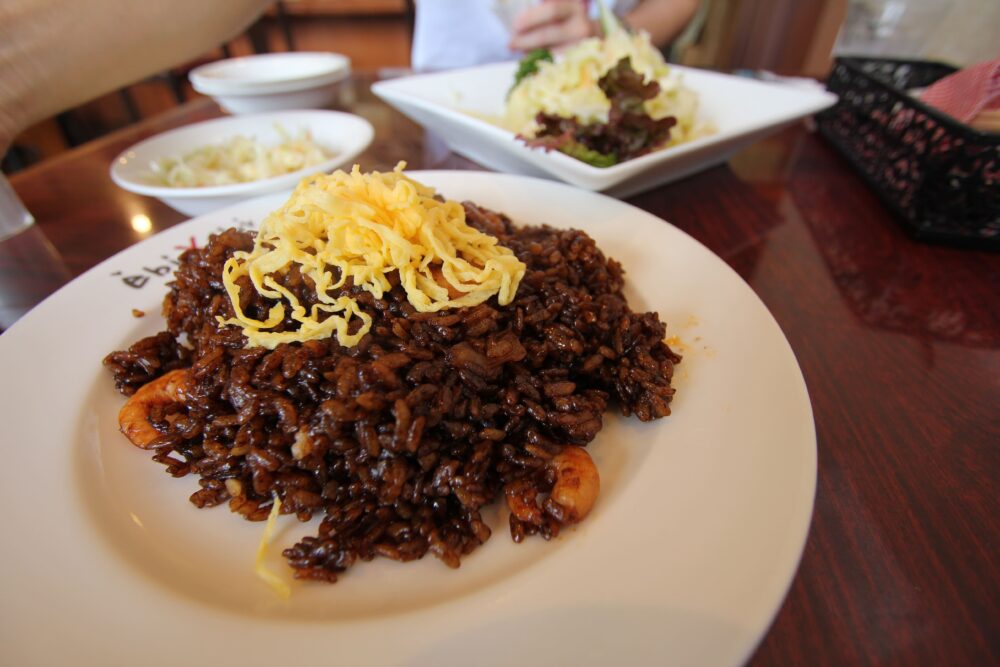 黒い見た目のごはんにぷりっとしたエビがのった、地元民に愛されるソウルフードです。