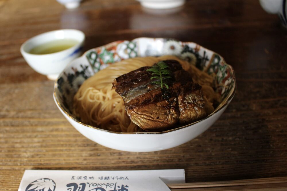 滋賀県長浜の名物「焼き鯖そうめん」は、香ばしく焼いた鯖を甘辛く煮付け、そうめんの上にのせた郷土料理。