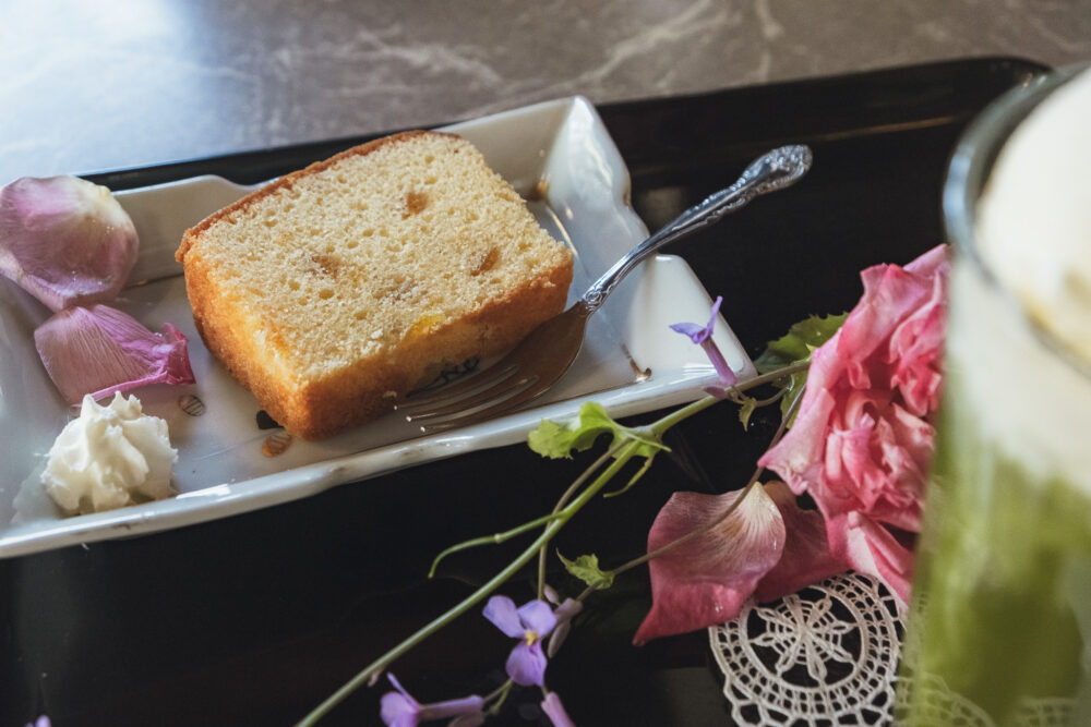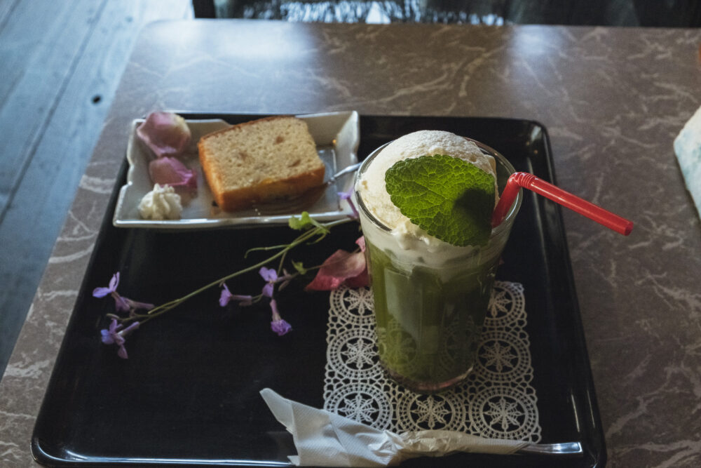 注文したのは、お店の方におすすめされたパウンドケーキと抹茶フロート。