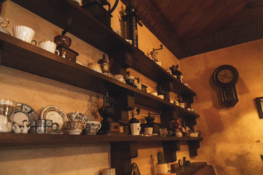 少し暗めの照明にアンティークのインテリアが飾られ、独特の雰囲気が漂っています。