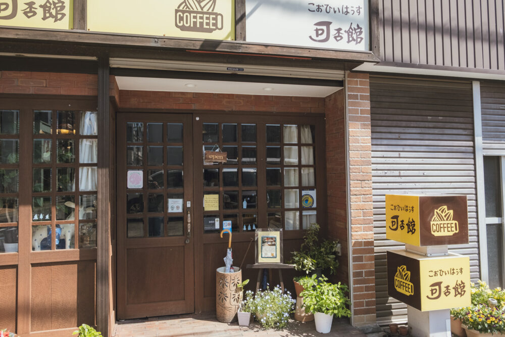 こおひいはうす可否館は、黄色い看板が目印のこじんまりした温かい雰囲気の喫茶店です。