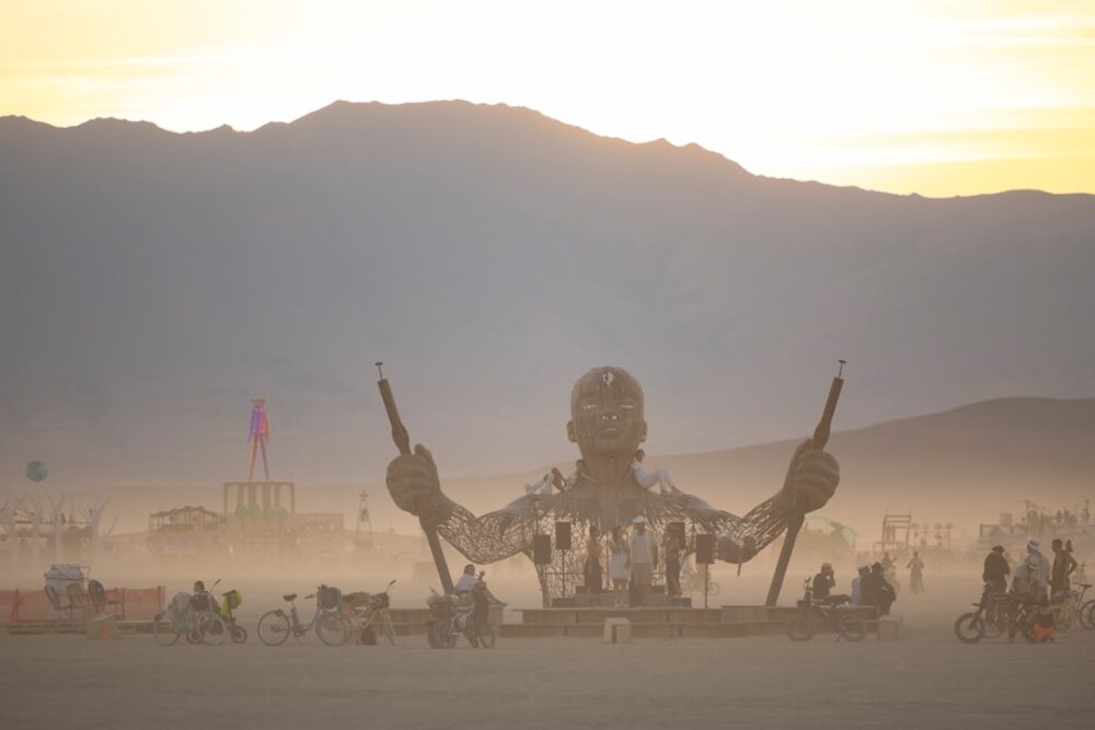 砂漠の何もない荒野に約7万人が集まり、巨大なアート作品を建造し、最終日にはシンボルとなる木造の人形を燃やします。